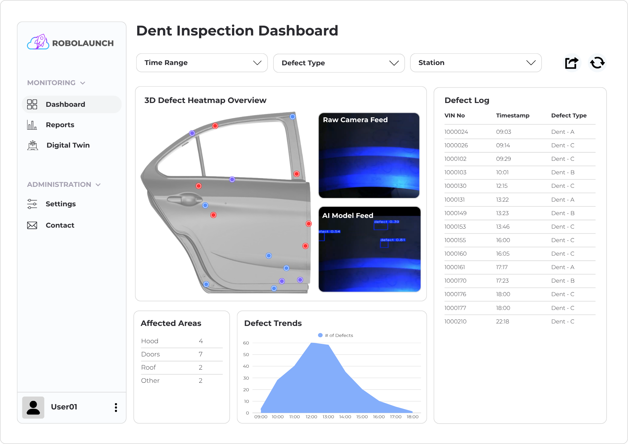 Every detected defect is projected onto a real-time 3D model of the inspected vehicle panel, creating a digital twin of surface quality. The interactive dashboard logs pass/fail results, defect types, timestamps, and model confidence scores. This enables full traceability across stations and provides the insights necessary for quality assurance and continuous process optimization.